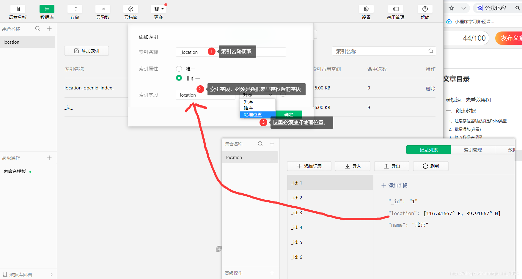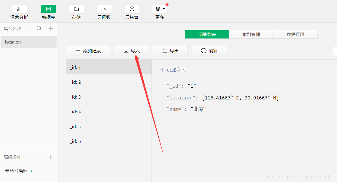 如上图所示,我们可以直接在云开发数据库里添加位置信息,类型是geopoint类型。