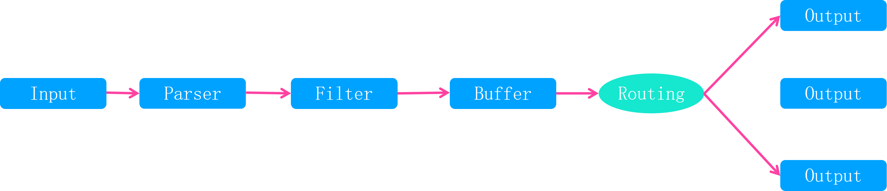 日志通过数据管道从数据源发送到目的地,一个数据管道通常由 Input、Parser、Filter、Buffer、Routing 和 Output组成。