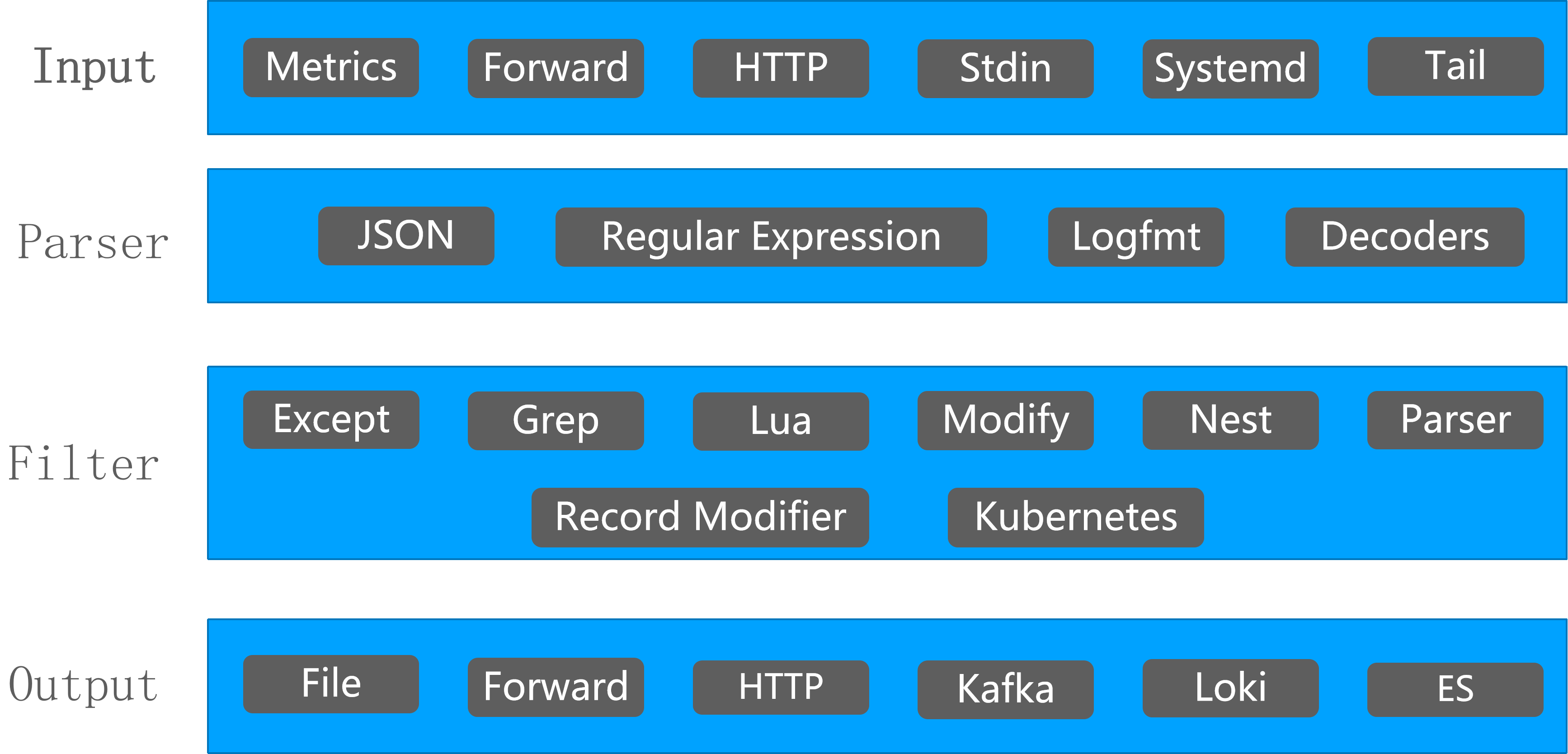 Fluent Bit 支持多种类型的 Input、Parser、Filter、Output 插件,可以应对各种场景。