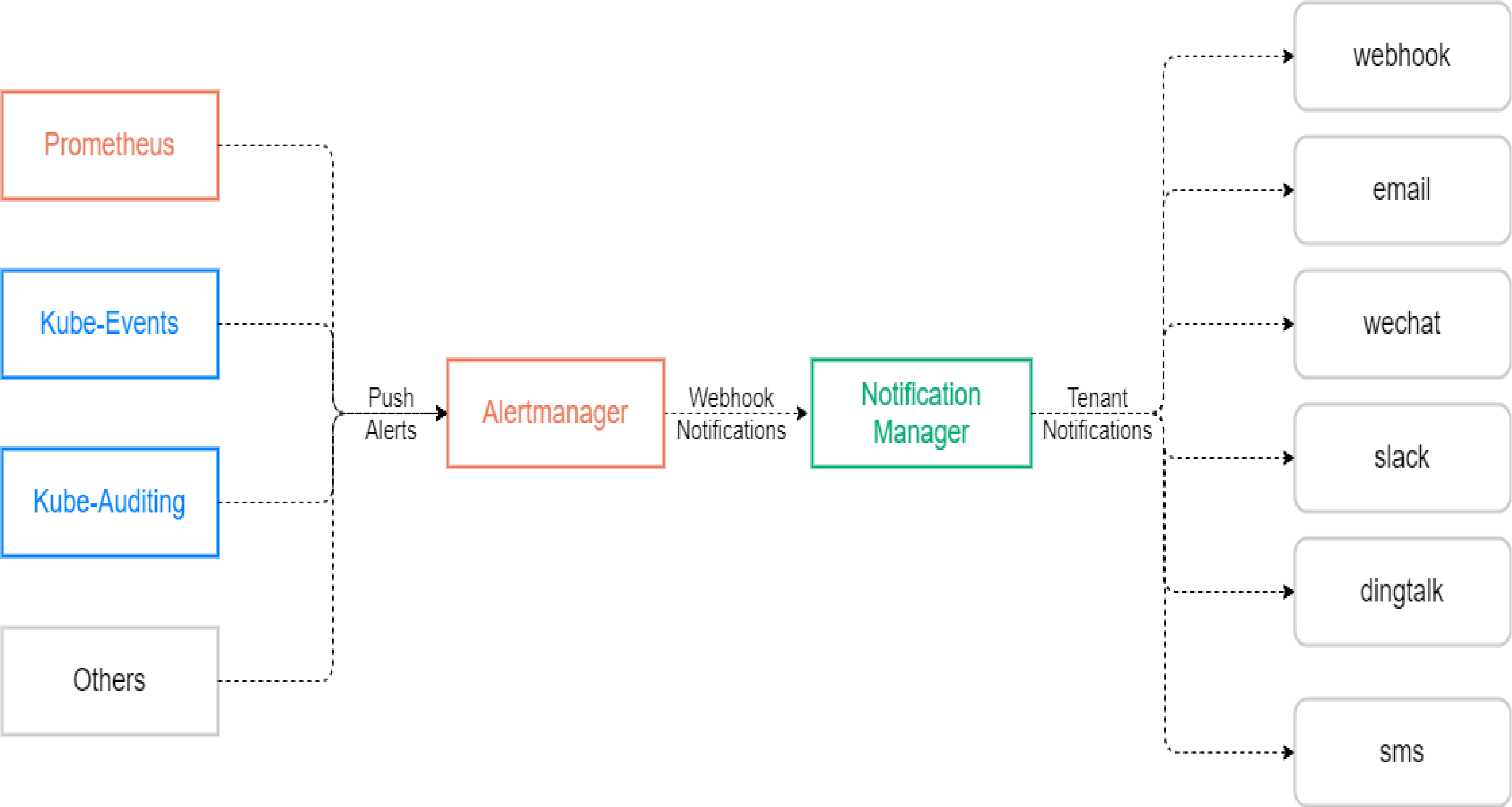 Notification Manager 是 KubeSphere 可观测团队开源的一款 Kubernetes 平台上的多租户通知管理系统,其从 Alertmanager 接收告警消息,并根据告警消息的租户标签(如 namespace)将告警消息发送到对应的通知渠道,DingTalk,Email,Slack,WeCom,Webhook,短信平台(阿里、腾讯,华为)等。
