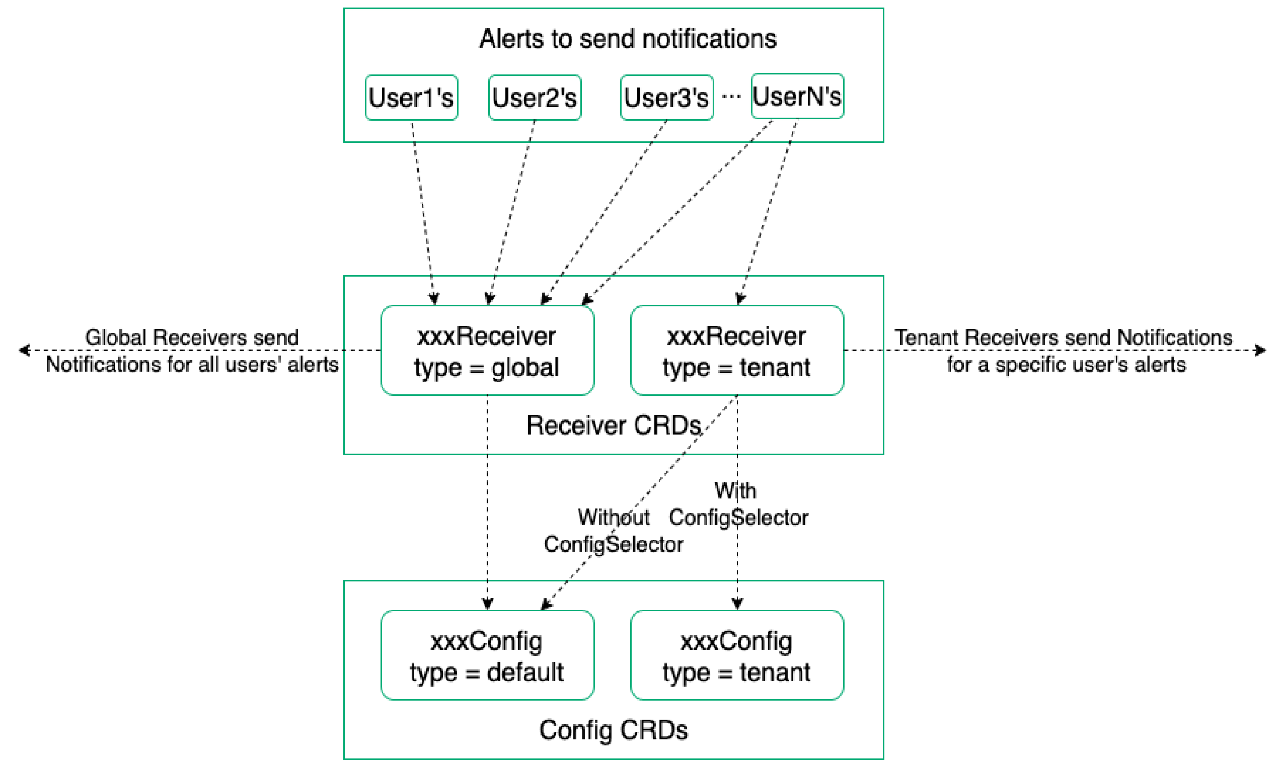 Notification Manager 采用了发送配置和接收配置分离的模式,即使用 Config 定义发送配置,使用 Receiver 定义接收配置,Receiver 通过标签选择发送通知需要使用的发送配置。Config 和 Receiver 分为全局和租户两种类型,通过以下标签进行区分。