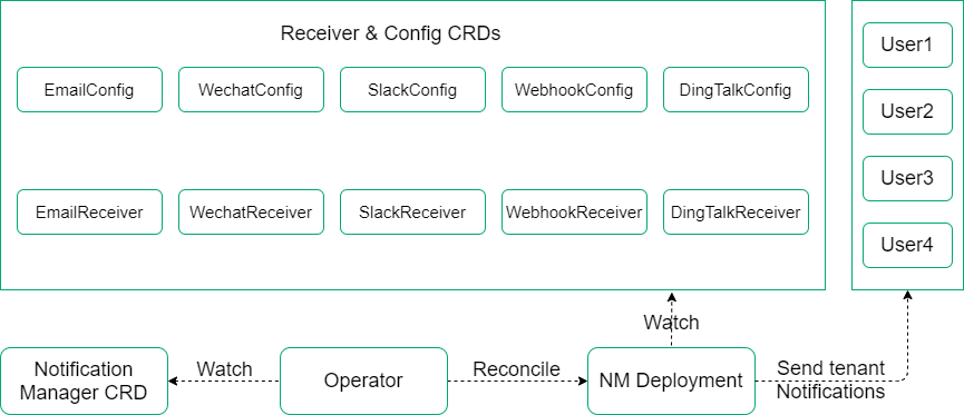 Notification Manager 由 Operator 和 Deployment 两部分组成,Operator 用于创建和管理 Deployment,Deployment 用于接收告警消息,生成通知消息,并根据告警消息的租户标签(如 namespace)将通知消息发送到对应的通知渠道。