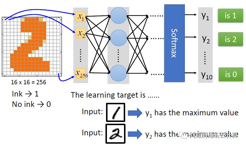 于是将n个神经元通过像一张神经网络一样连接在一起,n这个数字可以很大很大,所有的神经元可以分成很多列,每一列很多个排列起来,每个神经元的对于输入的权重可以都不相同,从而每个神经元的公式也不相同。当人们从这张网络中输入一个东西的时候,希望输出一个对人类来讲正确的结果。例如上面的例子,输入一个写着2的图片,输出的列表里面第二个数字最大,其实从机器来讲,它既不知道输入的这个图片写的是2,也不知道输出的这一系列数字的意义,没关系,人知道意义就可以了。正如对于神经元来说,他们既不知道视网膜看到的是美女,也不知道瞳孔放大是为了看的清楚,反正看到美女,瞳孔放大了,就可以了。