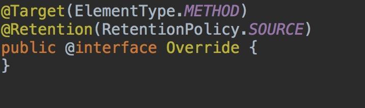 元注解是由java提供的基础注解,负责注解其它注解,如上图Override被@Target和@Retention修饰,它们用来说明解释其它注解,位于sdk/sources/android-25/java/lang/annotation路径下。