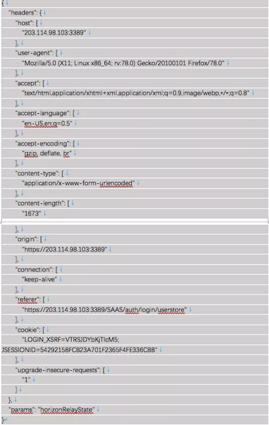 可看到完整 HTTP 请求细节,params参数为存在 log4j 注入漏洞的参数