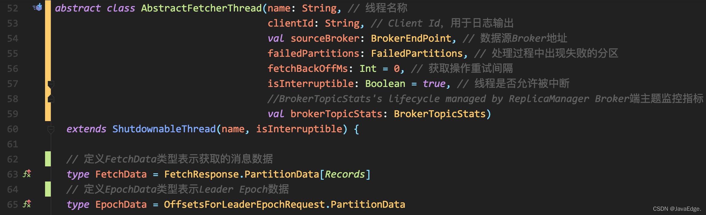 除了构造器的这几个字段,AbstractFetcherThread还定义了两个type类型。关键字type定义一个类型,可当做一个快捷方式,如FetchData: