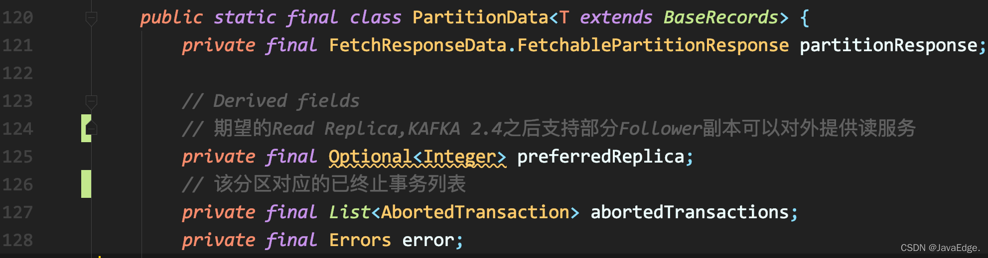 FetchData定义里的PartitionData类型,是客户端clients工程中FetchResponse类的嵌套类。FetchResponse类封装的是FETCH请求的Response对象,其内PartitionData是个POJO,保存Response中单个分区数据拉取的各项数据: