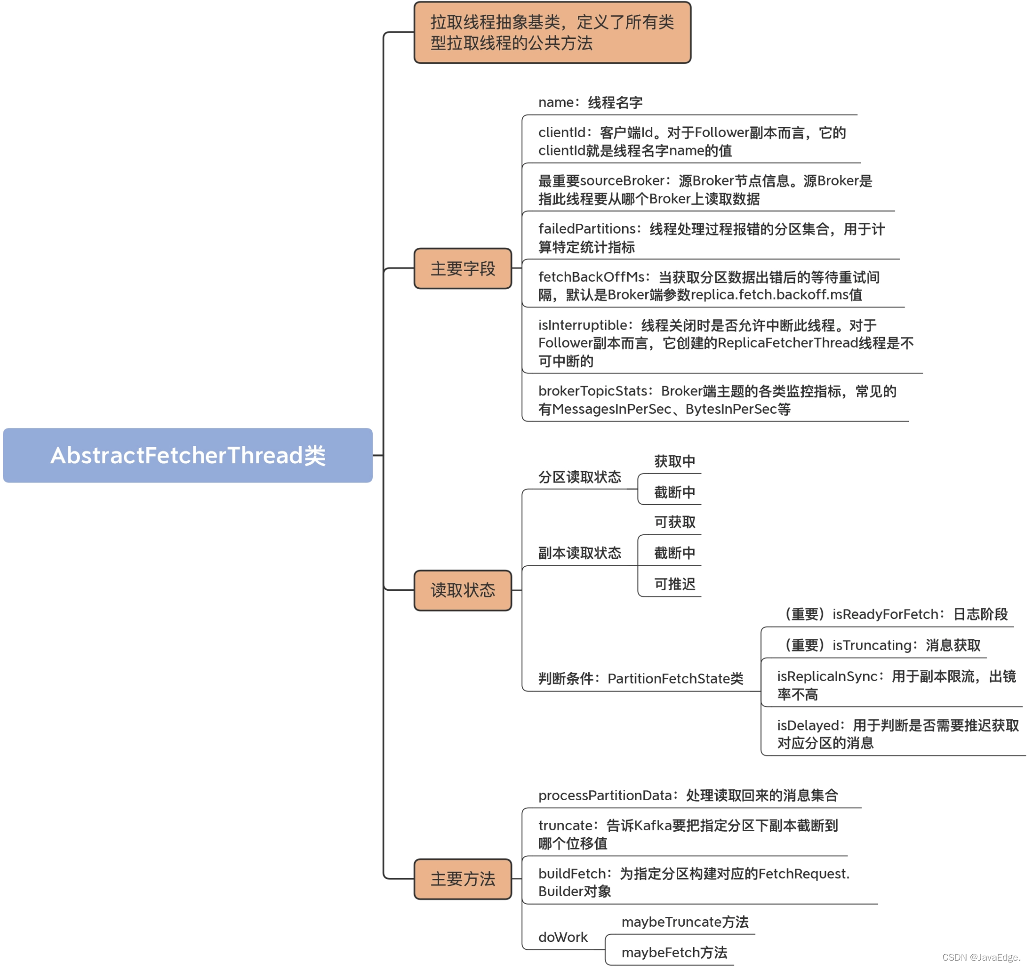 AbstractFetcherThread类:拉取线程的抽象基类。它定义了公共方法处理所有拉取线程的共同逻辑,如执行截断操作,获取消息。