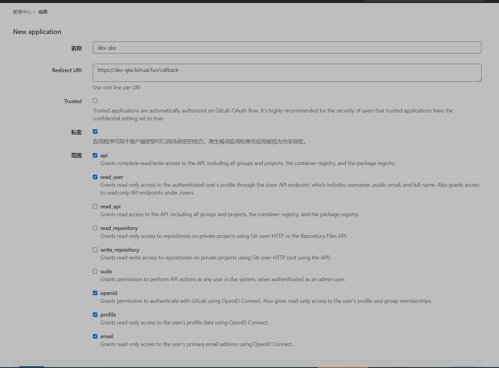 首先需要在 gitlab 上创建应用,在范围里勾选这几个 read_user profile email openid,创建后需要记住页面上的应用程序 id 和密码,后面会用得到。