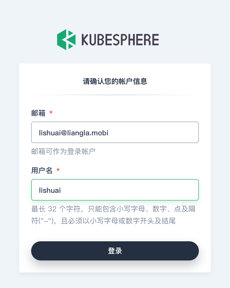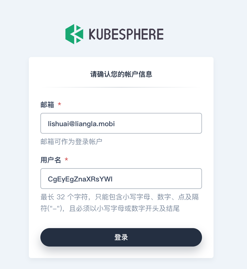 点击 authorize 允许后,KubeSphere 会让我们确认账户信息,此时需要合理修改用户名。