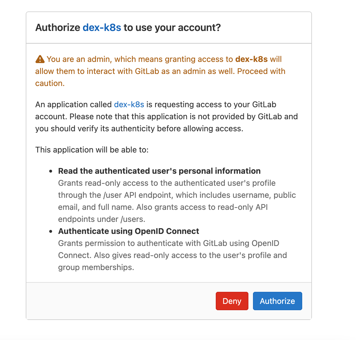 点击后会自动跳转到 Gitlab 进行认证,第一次登陆需要授权应用可以访问,这里要注意允许访问的 KubeSphere 的 Gitlab用户为 Dex 服务中定义的 Gitlab 项目组中的用户,实际中我们可以设置特定特定的项目组,将用户添加到项目组中来实现用户登陆的限制。