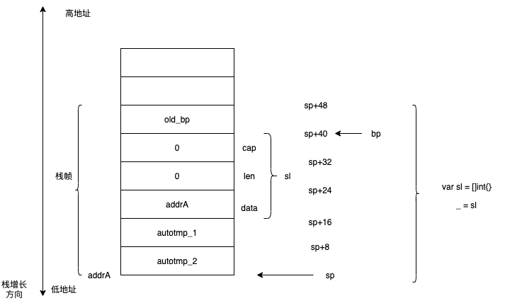 我们看到切片sl的指向底层数组的指针data的值实际上是一个栈上的内存单元的地址,Go编译器并没有在堆上额外分配新的内存空间作为切片sl的底层数组。只是上面汇编代码的第00019行、00023行的操作让人很迷,不知道这两部指令操作的意图为何。