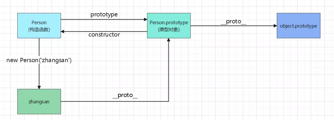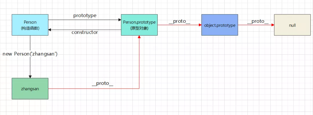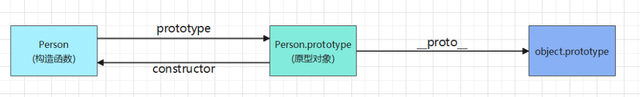 - 实例对象通过将proto属性指向构造函数的原型对象(Person.prototype),实现了该原型对象的继承。