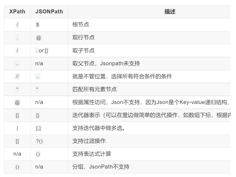 Json结构清晰,可读性高,复杂度低,非常容易匹配,下表中对应了XPath的用法。