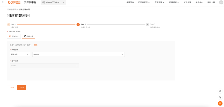 • 选择fork好的“Angular”代码仓库。选择第一步中的代码仓库,主干分支,并点击下一步。主干分支一般指的是代码的master或main等分支。