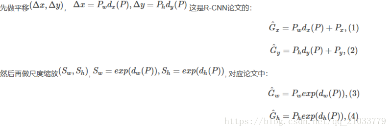 需要进行的平移变换和尺度缩放 , 或者说是。 我们的最终输出不应该是 Ground Truth 吗? 是的, 但是有了这四个变换我们就可以直接得到 Ground Truth, 这里还有个问题, 根据(1)~(4)我们可以知道, P 经过 得到的并不是真实值 G, 而是预测值。 的确, 这四个值应该是经过 Ground Truth 和 Proposal 计算得到的真正需要的平移量 和尺度缩放 。