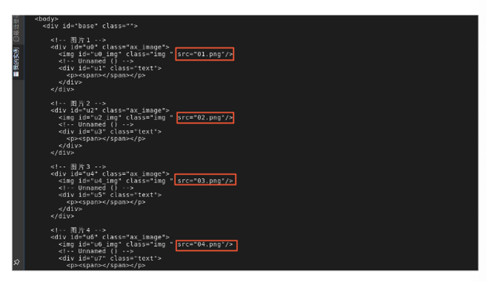 切换至Workbench远程连接页签,删除当前目录中的所有.png文件,可看到图片分享网站读取的ECS实例中的图片文件均无法正常显示。切换至文件存储OSS管理控制台页签。在文件管理页签中,单击01.png,复制文件URL。切换至Workbench远程连接页签,修改图片分享网站的源码。按i键进入编辑模式,找到下的标签中的src参数,将scr参数修改为图片的URL。重复上一步骤,修改02png、03png、04png。修改完成后文件内容如下所示。