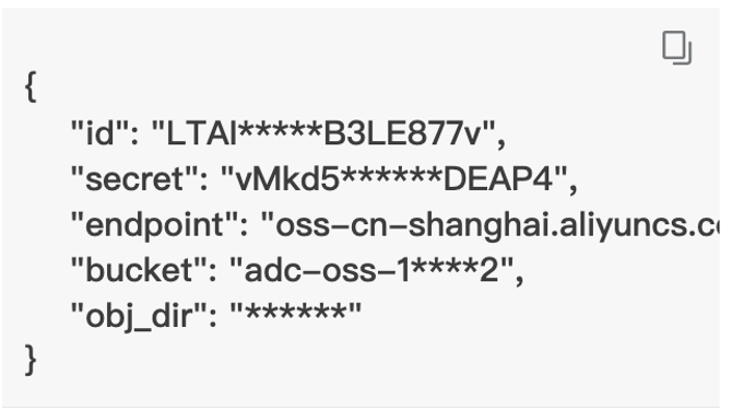 在Workbench远程连接页签,配置cfg.json文件中的OSS信息,分别找到以下参数,并将以下参数根据实际情况进行修改。
