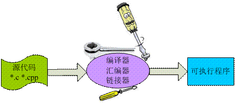 在Linux操作系统中,普遍使用ELF格式作为可执行程序或者程序生成过程中的中间格式。ELF(Executable and Linking Format,可执行连接格式)是UNIX系统实验室(USL)作为应用程序二进制接口(Application BinaryInterface,ABI)而开发和发布的。工具接口标准委员会(TIS)选择了正在发展中的ELF标准作为工作在32位Intel体系上不同操作系统之间可移植的二进制文件格式。本文不对ELF文件格式及其组成做太多解释,以免冲淡本文的主题,大家只要知道这么个概念就行。以后再详解Linux中的ELF格式。源代码到可执行程序的转换时需要经历如下图所示的过程: