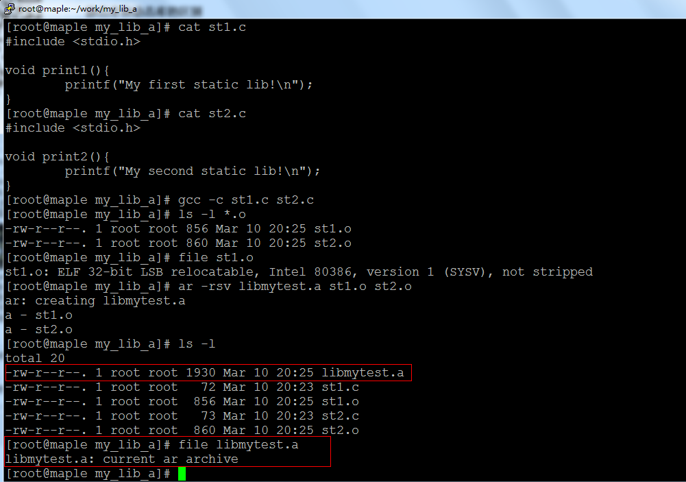 准备两个库的源码文件st1.c和st2.c,用它们来制作库libmytest.a,如下: