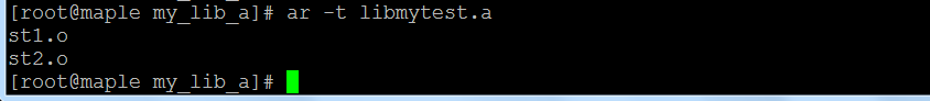 静态库文件libmytest.a已经生成,用file命令查看其属性,发现它确实是归档压缩文件。用ar -t libmytest.a可以查看一个静态库包含了那些obj文件: