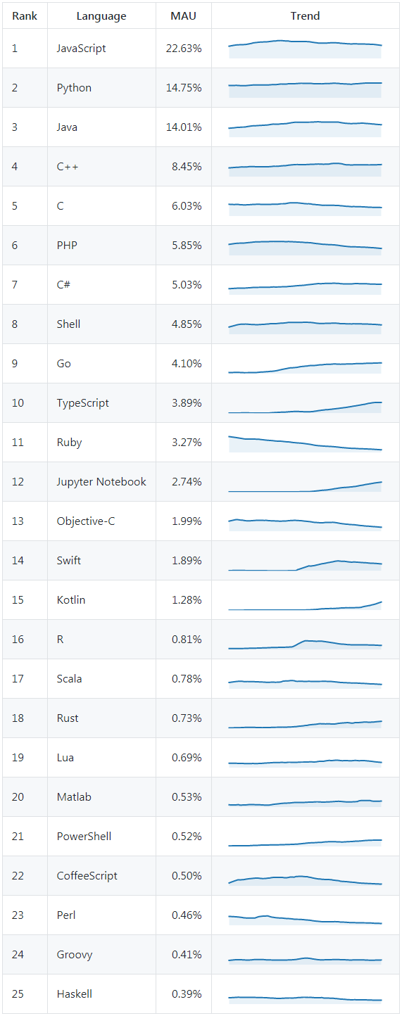 先看看总体数据,截至 2018 年 1 月 24 日,通过统计 GitHub 上活跃用户的活动情况,对每种语言的排名结果如下(TOP 25):