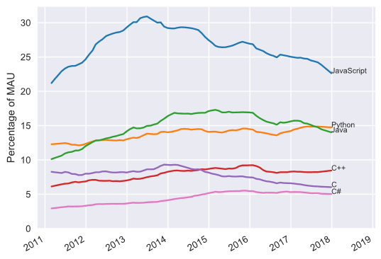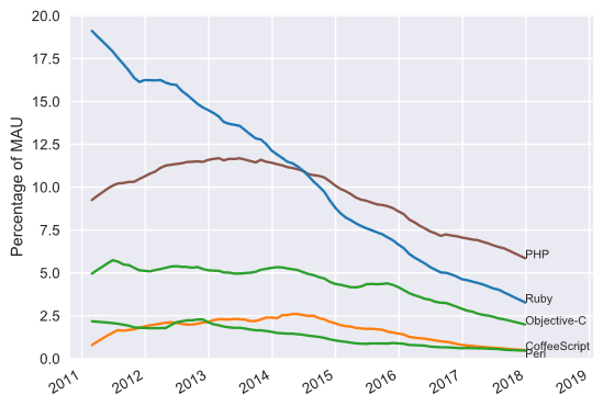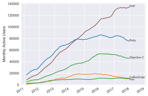在过去的 7 年里,Ruby,PHP,Objective-C,CoffeeScript 和 Perl 在 GitHub 上的用户比例都显着下降。