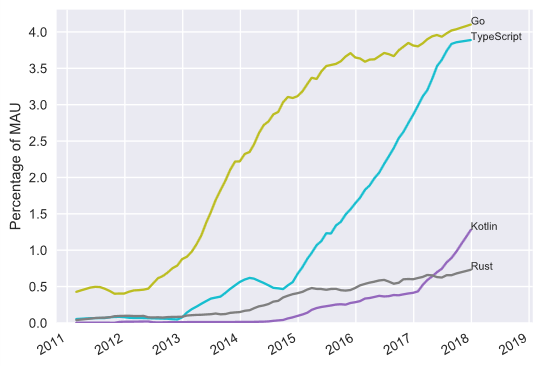 明显能看到,用户群增长最快的语言分别有:Go,TypeScript,Kotlin 和 Rust。