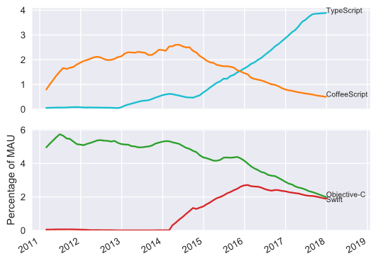 此外要注意的是,某些较新的语言似乎在蚕食旧版语言的用户群。例如,Objective-C 用户的下降与 Swift 的上升相对应。另外,CoffeeScript 似乎已经被 TypeScript 取代: