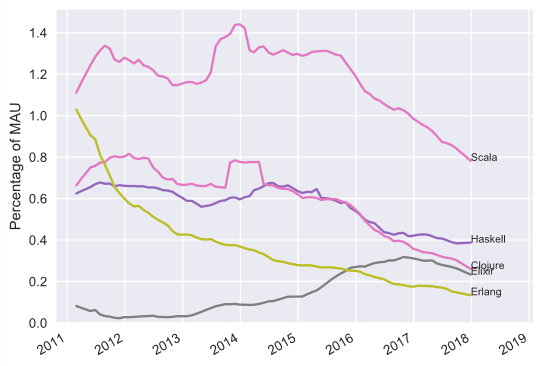 这样来看,相比 2011 年,使用 Ruby 语言的活跃用户数量已经超过了3倍。它的增长没有其他语言那么快,导致它在这个分析上的表现相对较差。