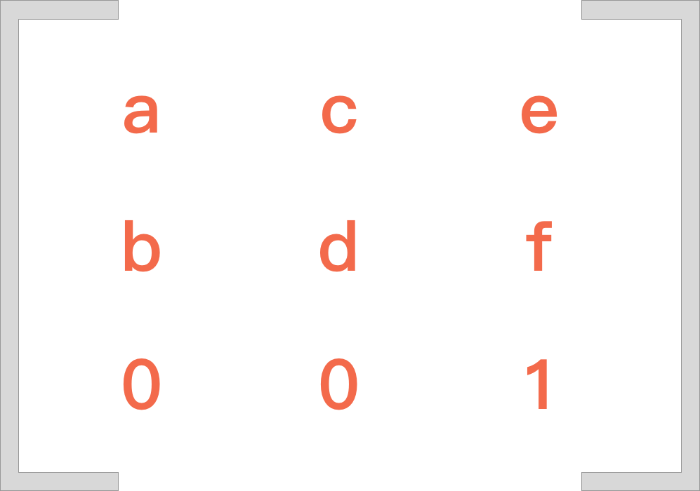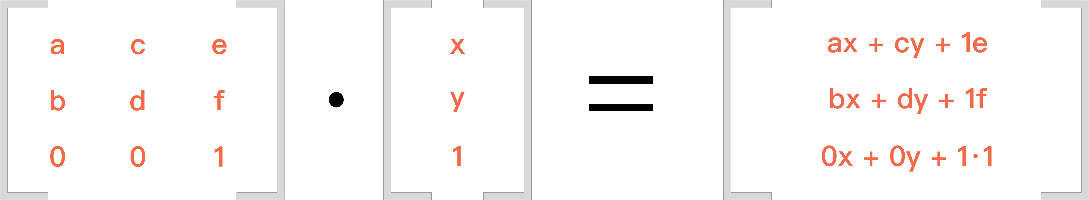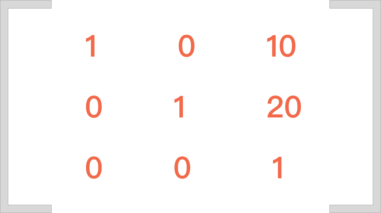 }2D 的转换是由一个 3*3 的矩阵表示的,前两行代表转换的值,分别是 a b c d e f,要注意是竖着排的,第一行代表 x 轴发生的变化,第二行代表 y 轴发生的变化,第三行代表 z 轴发生的变化,因为这里是 2D 不涉及 z 轴,所以这里是 0 0 1。