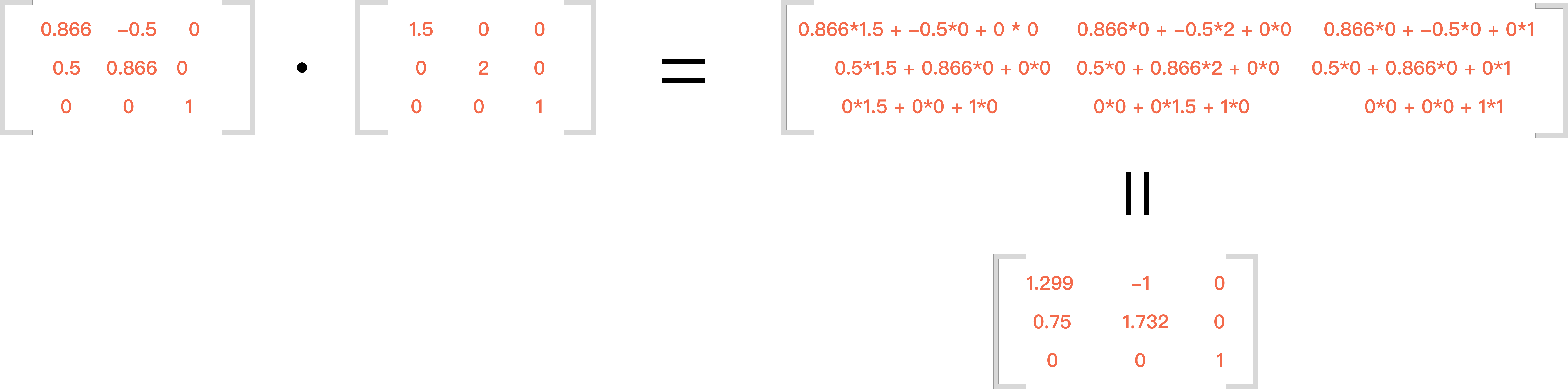 如果我们既要旋转又要缩放又要偏移,我们需要将旋转和缩放和偏移和位移多个矩阵相乘,要按照transform里面rotate/scale/skew/translate所写的顺序相乘。