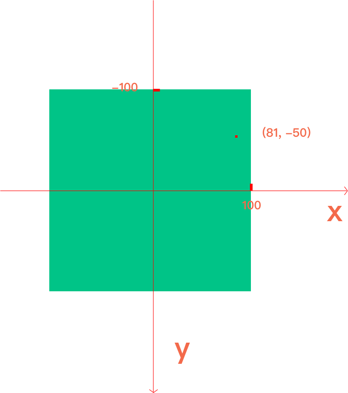根据题目我们知道,这个点相对于绿色div左上角的坐标是(181, 50) 绿色div的宽高为200 基于绿色div中心点建立的坐标系,这个点的坐标是(81, -50)