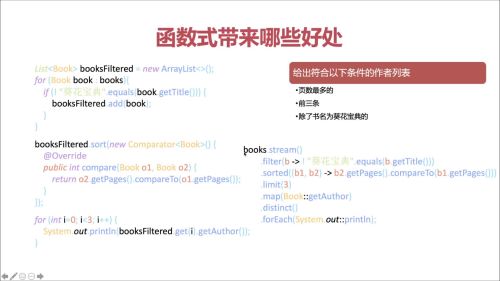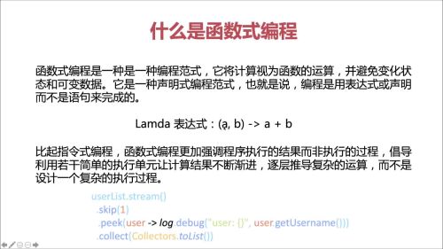 - 函数式编程能够简化代码步骤,更加注重的是具体业务流程操作,直接向着业务需要的结果出发,对一些具体的细节进行隐藏,提高生产效率。