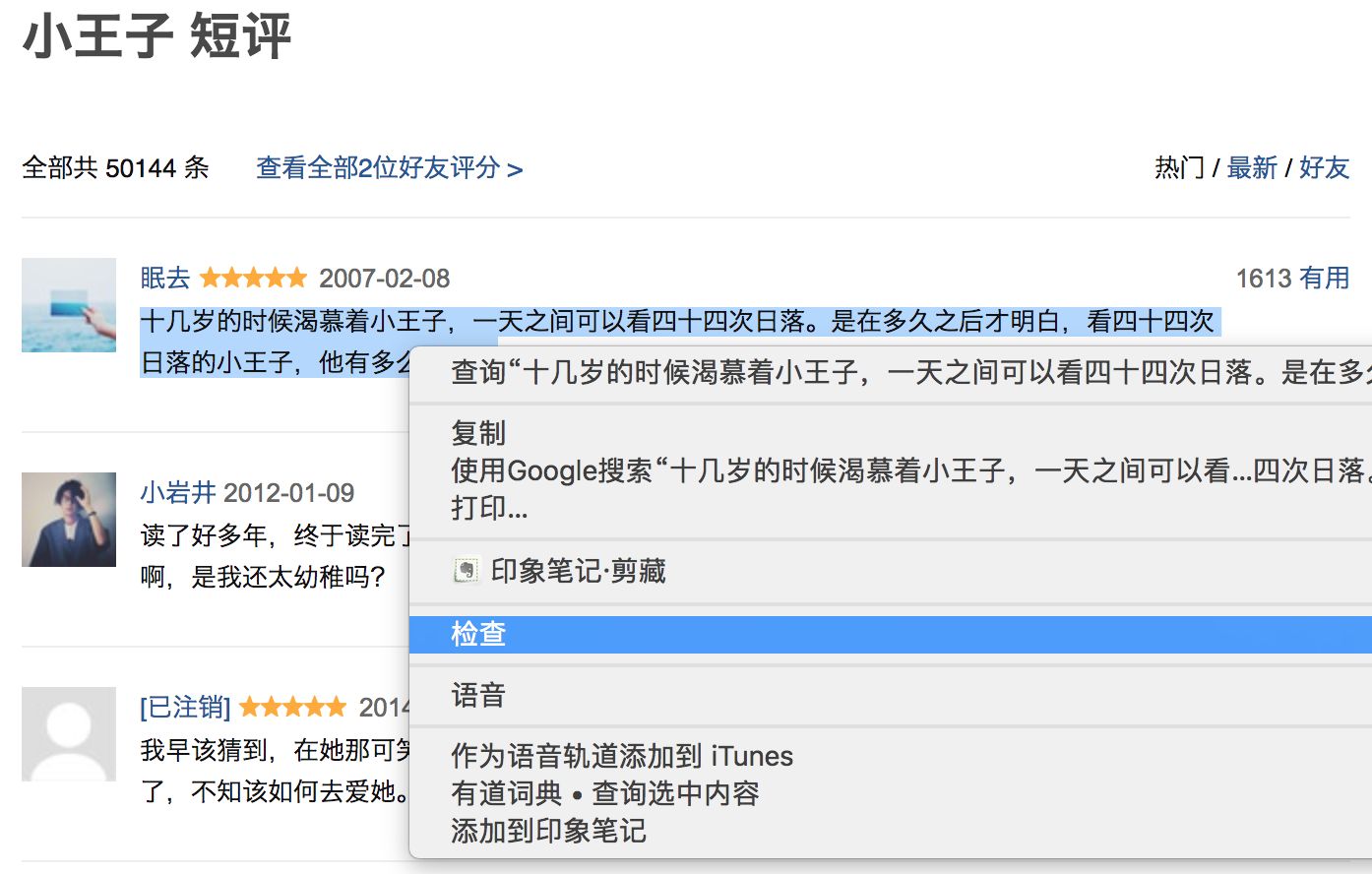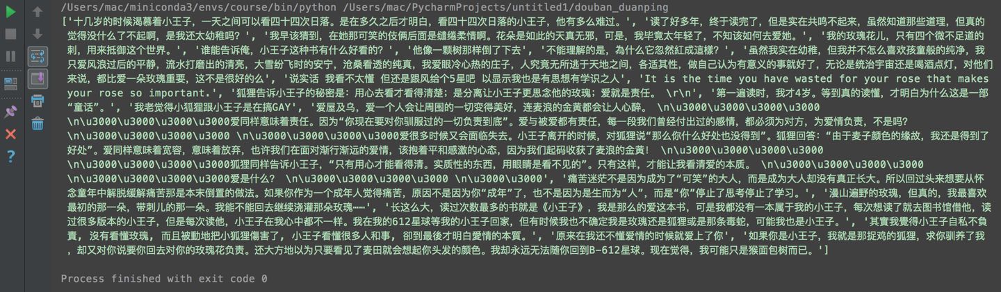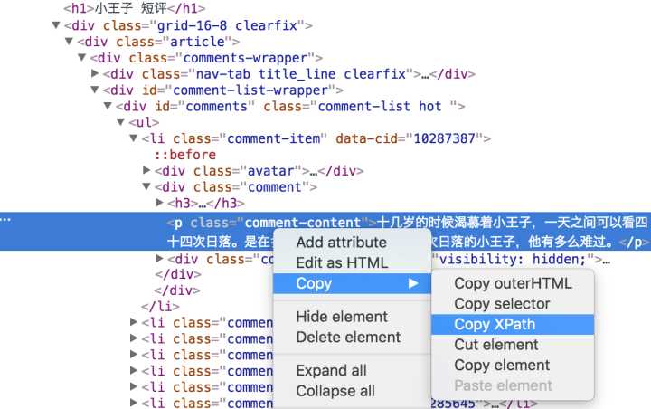 后面的序号不一样,恰好与短评的序号相对应。那如果我们想爬取这个页面所有的短评信息,那么不要这个序号就好了呀。通过XPath信息,我们就可以用简单的代码将其爬取下来了:
