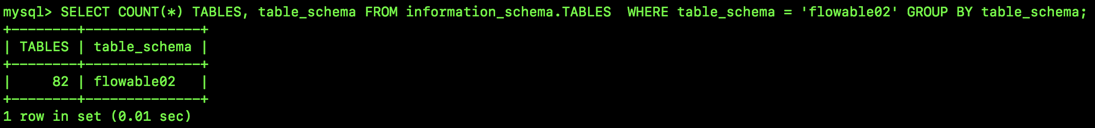 SELECT COUNT(*) TABLES, table_schema FROM information_schema.TABLES  WHERE table_schema = 'flowable02' GROUP BY table_schema;