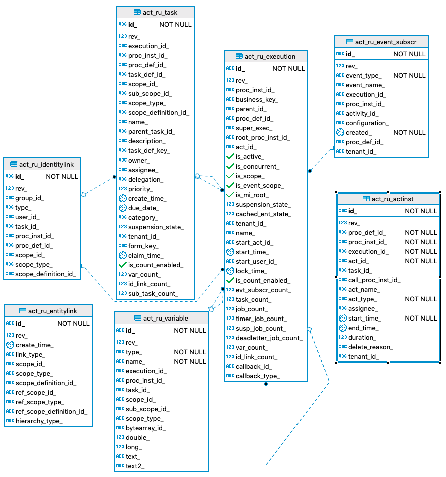 以 ACT_RU_ 开头的表都是和流程引擎运行时信息相关的一些表。涉及到的表一共有 13 张: