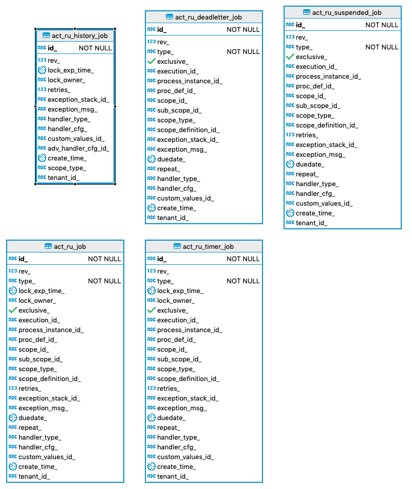 具体来说,与 Flowable 开源代码库相关的数据库表名以 ACT_ 开头。特定于 Flowable Work 或 Engage 的数据库表以 FLW_ 前缀开头。