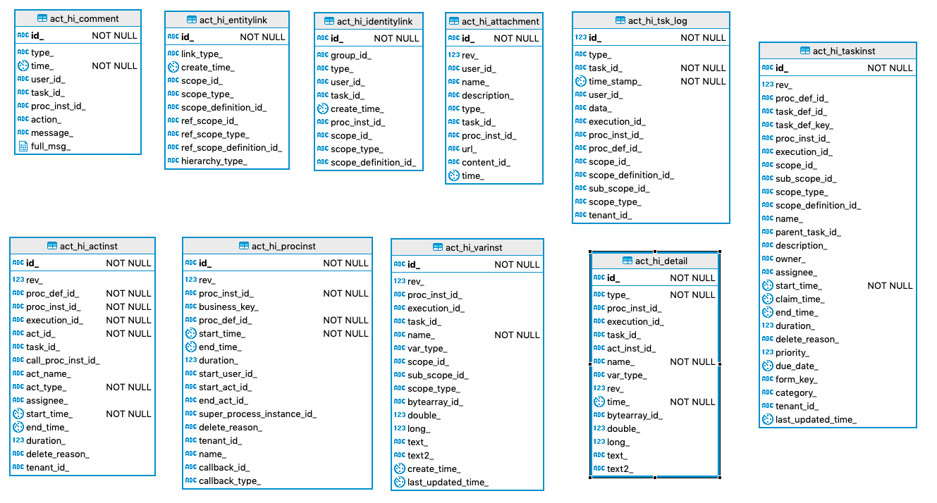 以 ACT_HI_* 开头的表包含正在运行和已完成的实例的历史数据,这些表的名称遵循其运行时对应的名称,这里一共涉及到 10 张表: