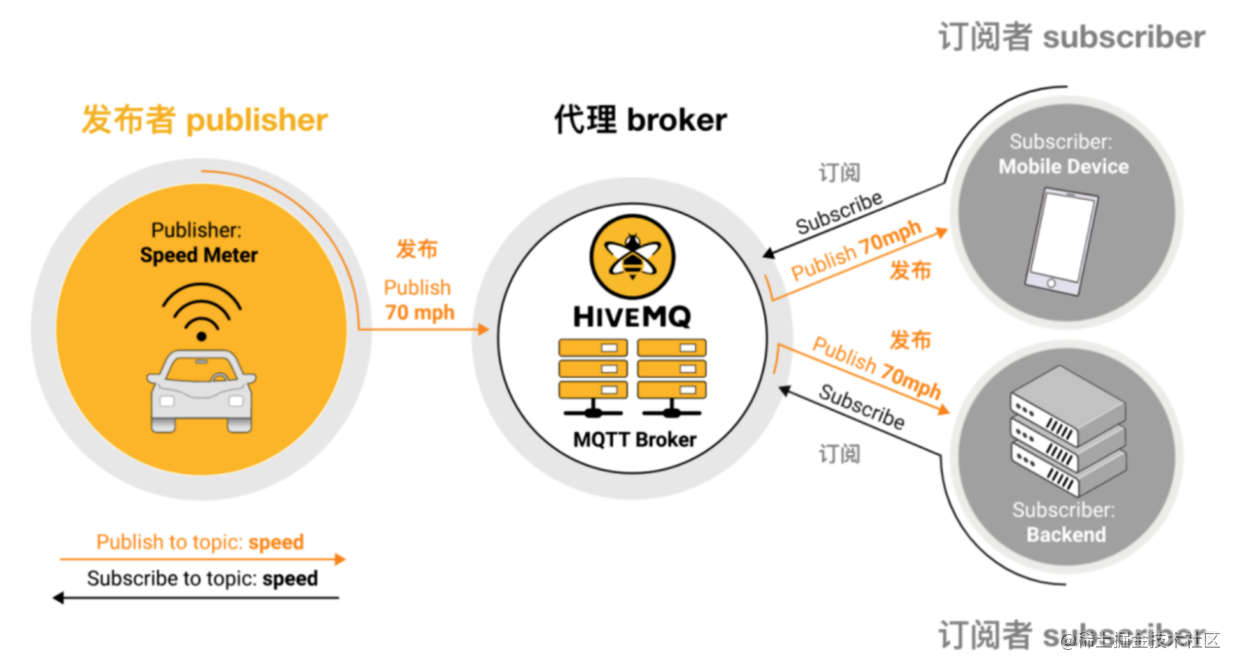 MQTT 是基于发布 - 订阅模型 (pub/sub) 的消息传递协议,与请求 - 响应模型不同,发布 - 订阅模型主要有三种角色:publisher & subscriber & subscriber: