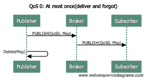 在 QoS 0 的等级的 PUBLISH 消息中不包含包唯一标识。发送者不考虑消息交付结果,接收者也不发送响应。接收者最多只能收到一次消息,也有可能一次也收不到。