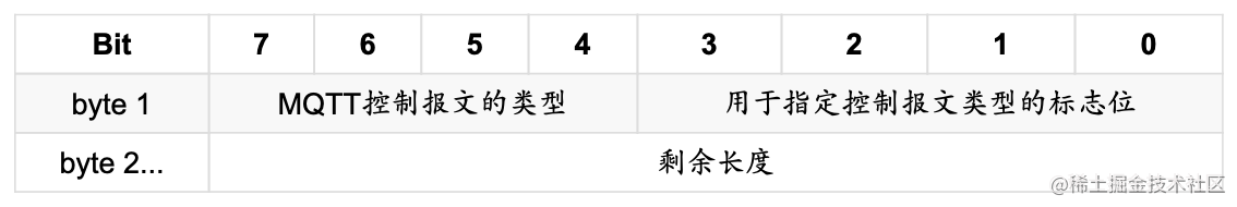 | 固定报头(Fixed header) | 存在于所有 MQTT 消息中 | 2 到 5 字节 |