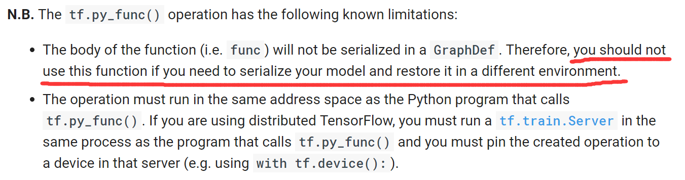 在使用过程中,有两个需要注意的地方,第一就是func函数的返回值类型一定要和Tout指定的tensor类型一致。第二就是,如下图所示,tf.py_func中的func是脱离Graph的。在func中不能定义可训练的参数参与网络训练(反传)。