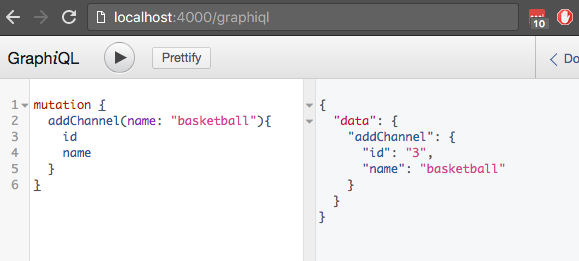 }, }, Mutation: { addChannel: (root, args) => { const newChannel = { id: nextId++, name: args.name };