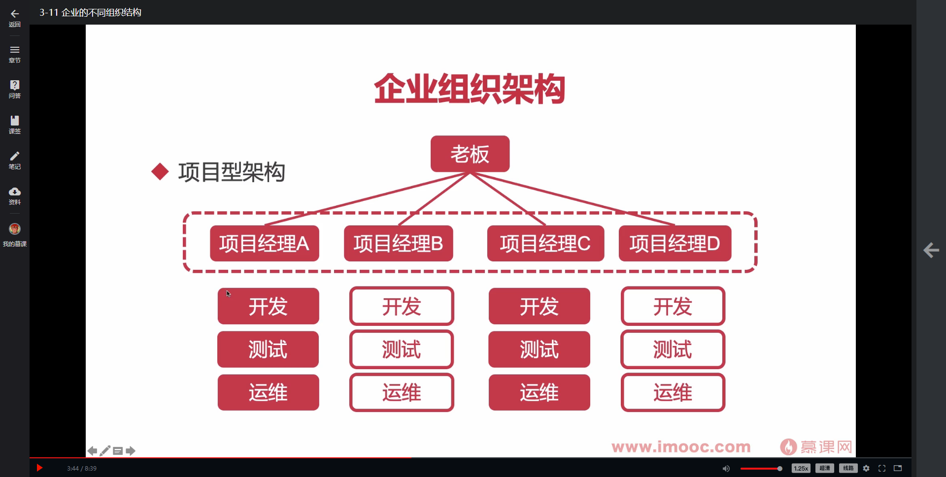 - 项目型:这个和职能型相反,项目经理拥有绝对的控制权,权利相当大,因为各个部门都在你之下,你可以随意调度。这个时候的开发部测试部运维部等团队其实都是为你服务的,如果有相应的部门,他们也是抽调人员直接归你管,这样一来你做这个项目的过程你就会自由度很大。