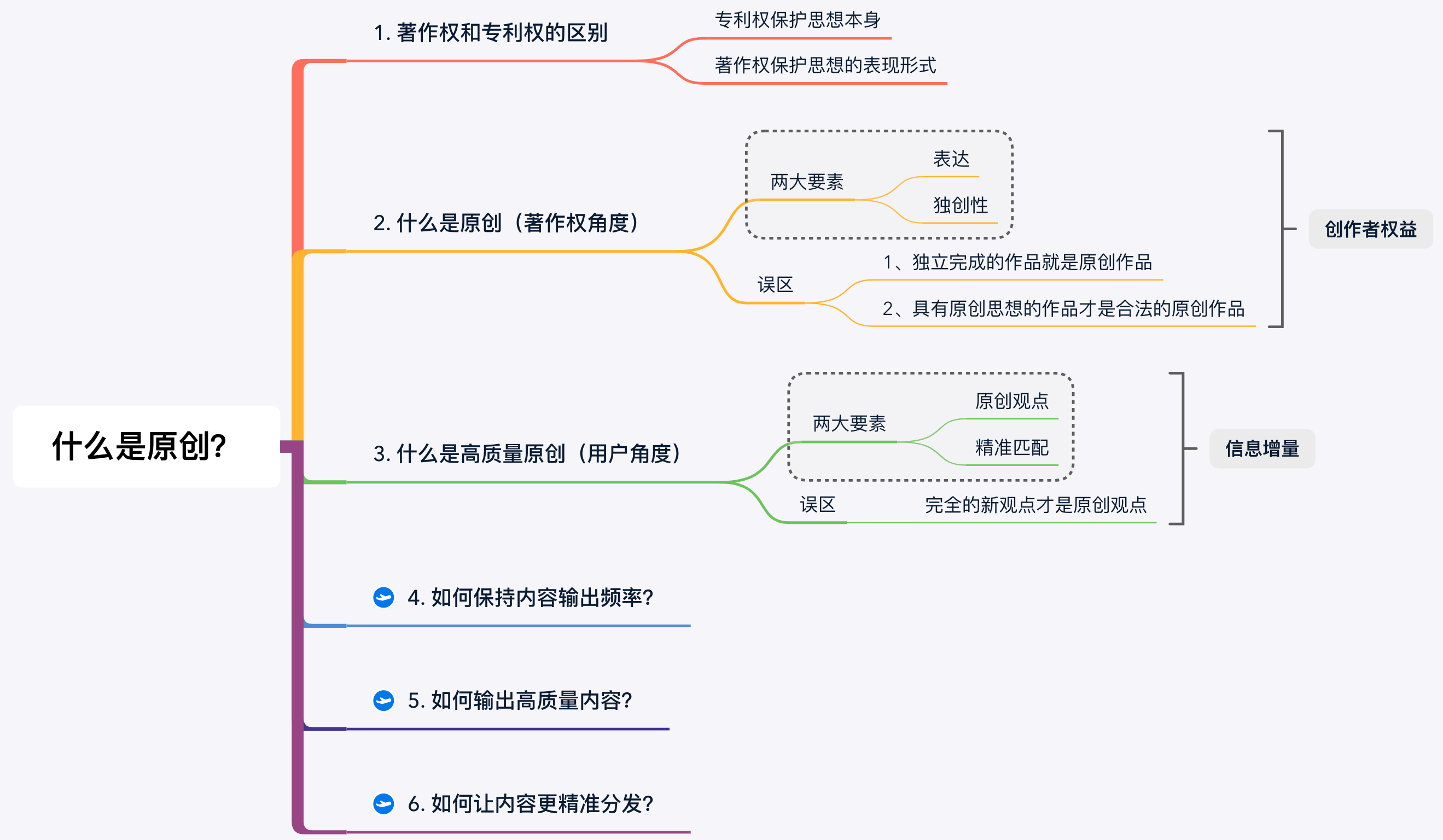 我认为对于原创的理解,应该从 2 个角度来看 —— 著作权 + 用户。著作权角度是立足于创作者的权益,是原创的基础标准,而用户角度是立足于用户的权益,是高价值原创的标准。 只有同时从著作权角度和用户角度看待一个作品,才能完整地体现一个作品的原创性。