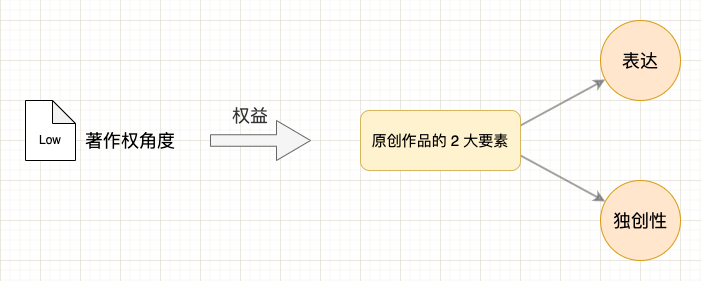 我们将以上三段法条连接起来,“原创作品” 的概念就已经比较清晰了。 2 个关键词:表达 + 独创性 ,具体可以分为 3 点: