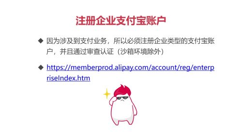 因为涉及支付业务,所以必须注册企业类型的支付宝账户,并且通过验证审核(沙箱环境除外);