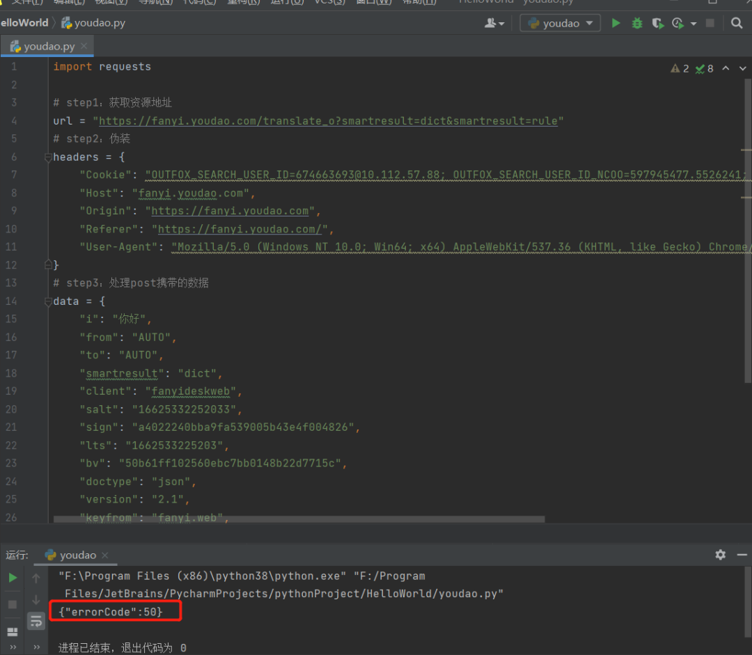 有道翻译之前有做过很多,确实适合练手,主要是需要找到对应的请求。这里【dcpeng】结合粉丝的代码,然后给了一份正确的代码,如下所示: