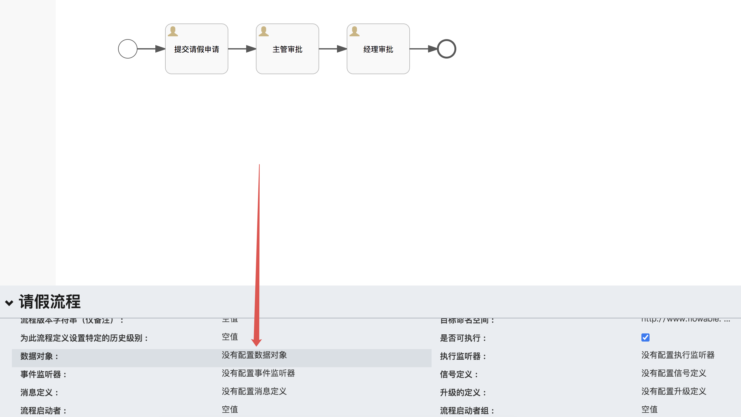首先打开流程图,不要选择任何节点,在下方可以找到数据对象属性,如下图: